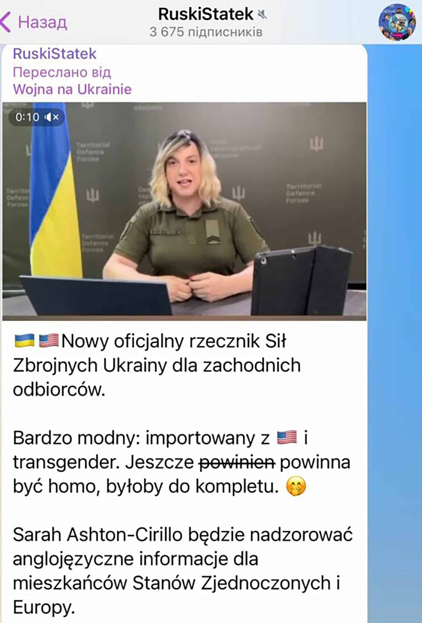 Nie tylko rosyjscy propagandziści dyskutują o transpłciowości rzeczniczki Sił obrony terytorialnej Sarah Ashton-Cirillo z USA. W polskich mediach, zwłaszcza na kanałach Telegramu, szerzy się też podobna „histeria” wokół tej osoby w Siłach Zbrojnych.