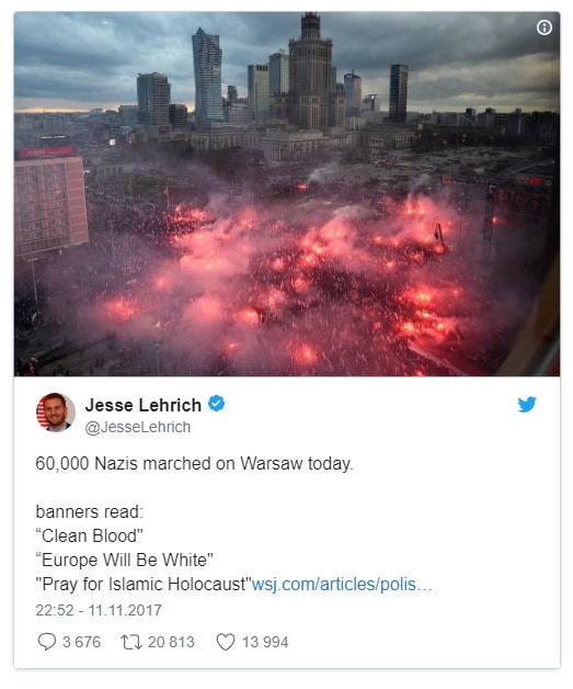 Przypomnijmy że były rzecznik Hillary Clinton ds. zagranicznych Jesse Lehrich skomentował na Twitterze Marsz Niepodległości, który 11 listopada odbył się w Polsce. Na jego koncie pojawiły się skandaliczne słowa. „60 tysięcy nazistów maszerowało w Warszawie” – napisał.