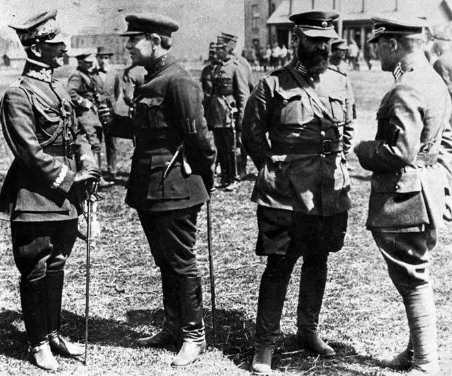 Gen. Antoni Listowski, Symon Petlura, płk Wołodymyr Salśkyj, płk Marko Bezruczko, oficerowie ukraińscy i polscy – Berdyczów, wyprawa kijowska, kwiecień 1920.