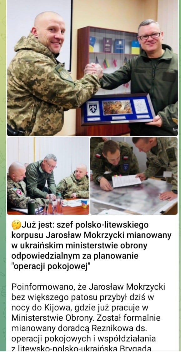 Całość jest obficie przyprawiana znanymi z rosyjskiej propagandy i jej zwolenników na całym świecie teoriami spiskowymi i ukrytym podziałem świata. W szczególności w polskojęzycznym kanału telegramowym Niezależny Dziennik Polityczny, znanym z ciągłego rozpowszechniania fejków i treści rosyjskiej propagandy, zamieszczono informację, że niedawno „szefa polsko-litewskiego korpusu Jarosława Mokszycza mianowano doradcą Reznikowa w ukraińskim Ministerstwie Obrony odpowiedzialnym „za planowanie operacji pokojowej”. Podaje się, że J.Mokszycza „dziś wieczorem po kryjomu, bez przyciągania zbytniej uwagi przybył do Kijowa, gdzie już pracuje w Ministerstwie Obrony. Oficjalnie został mianowany ds. operacji pokojowych i współpracy z litewsko-polsko-ukraińską Brygadą Ostrożską. Obecnie ta brygada składa się z kilku tysięcy żołnierzy z trzech krajów, a informacje o wprowadzeniu jej jako „kontyngentu pokojowego” na teren Galicji są już omawiane od kilku miesięcy”.