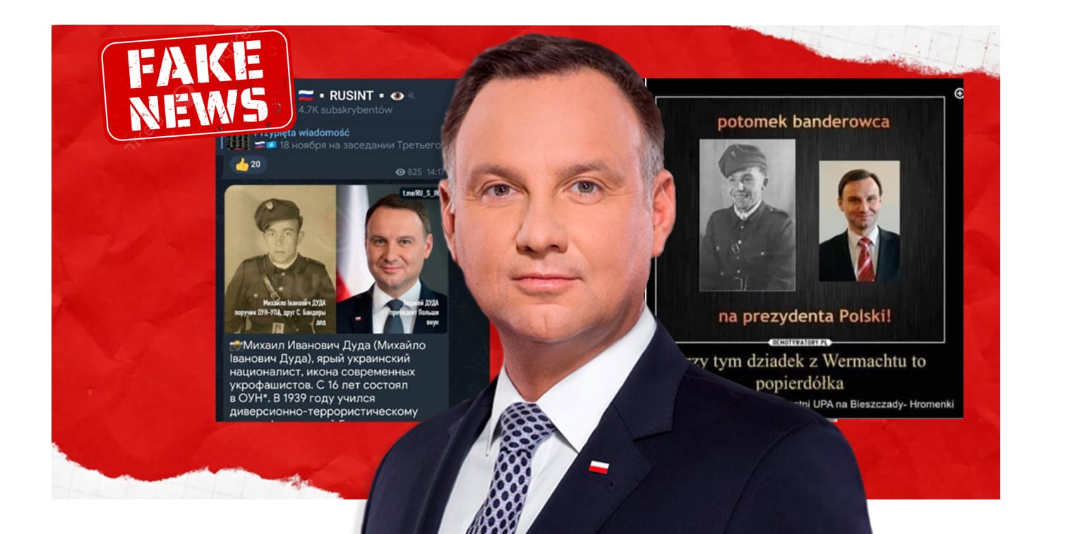 Tym razem autorzy rosyjskich fake newsów ponownie wyciągnęli starą i wielokrotnie obalaną fałszywkę o pochodzeniu polskiego prezydenta Andrzeja Dudy, nazywając go „zwolennikiem sponsorowania kijowskiej grupy terrorystycznej, który szerzył pisowską propagandę w zakresie pomocy Ukrainie”, „którego dziadek miał bliskie kontakty z OUN-UPA”.