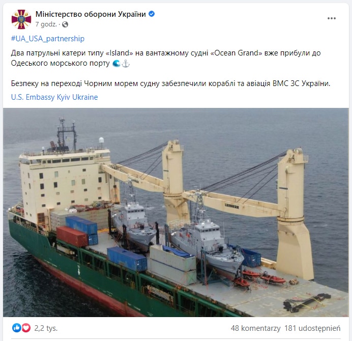 Bezpieczeństwo podczas przepływu statku przez Morze Czarne zapewniały okręty i samoloty Marynarki Wojennej Sił Zbrojnych Ukrainy, podaje na Facebooku biuro prasowe ministerstwa obrony Ukrainy.