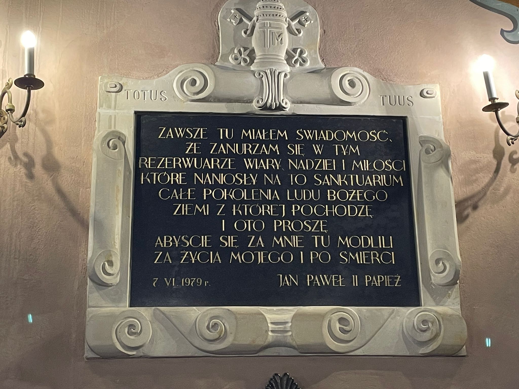 Powiedział wówczas: „Każdy, kto tu przychodzi, odnajduje siebie, swoje życie, swoją codzienność, swoją słabość i równocześnie moc wiary i nadziei – tę moc, która płynie z przekonania, że Matka nie opuszcza swego dziecka w niedoli, ale prowadzi je do Syna i zawierza Jego miłosierdziu”. Wtedy też wypowiedział słowa zawierzenia: „Wejrzyj, łaskawa Pani, na ten lud, który od wieków pozostawał wierny Tobie i Synowi Twemu. Wejrzyj na ten naród, który zawsze pokładał nadzieję w Twojej matczynej miłości. Wejrzyj, zwróć na nas swe miłosierne oczy, wypraszaj to, czego dzieci Twoje najbardziej potrzebują. Dla ubogich i cierpiących otwieraj serca zamożnych. Bezrobotnym daj spotkać pracodawcę. Wyrzucanym na bruk pomóż znaleźć dach nad głową. Rodzinom daj miłość, która pozwala przetrwać wszelkie trudności. Młodym pokazuj drogę i perspektywy na przyszłość. Dzieci otocz płaszczem swej opieki, aby nie ulegały zgorszeniu. Wspólnoty zakonne ożywiaj łaską wiary, nadziei i miłości. Kapłanów ucz naśladować Twojego Syna w oddawaniu co dnia życia za owce. Biskupom upraszaj światło Ducha Świętego, aby prowadzili ten Kościół jedną i prostą drogą do bram Królestwa Twojego Syna. (…) Tobie zawierzam losy Kościoła, Tobie polecam mój naród, Tobie ufam i Tobie raz jeszcze wyznaję: Totus Tuus, Maria! Totus Tuus”.